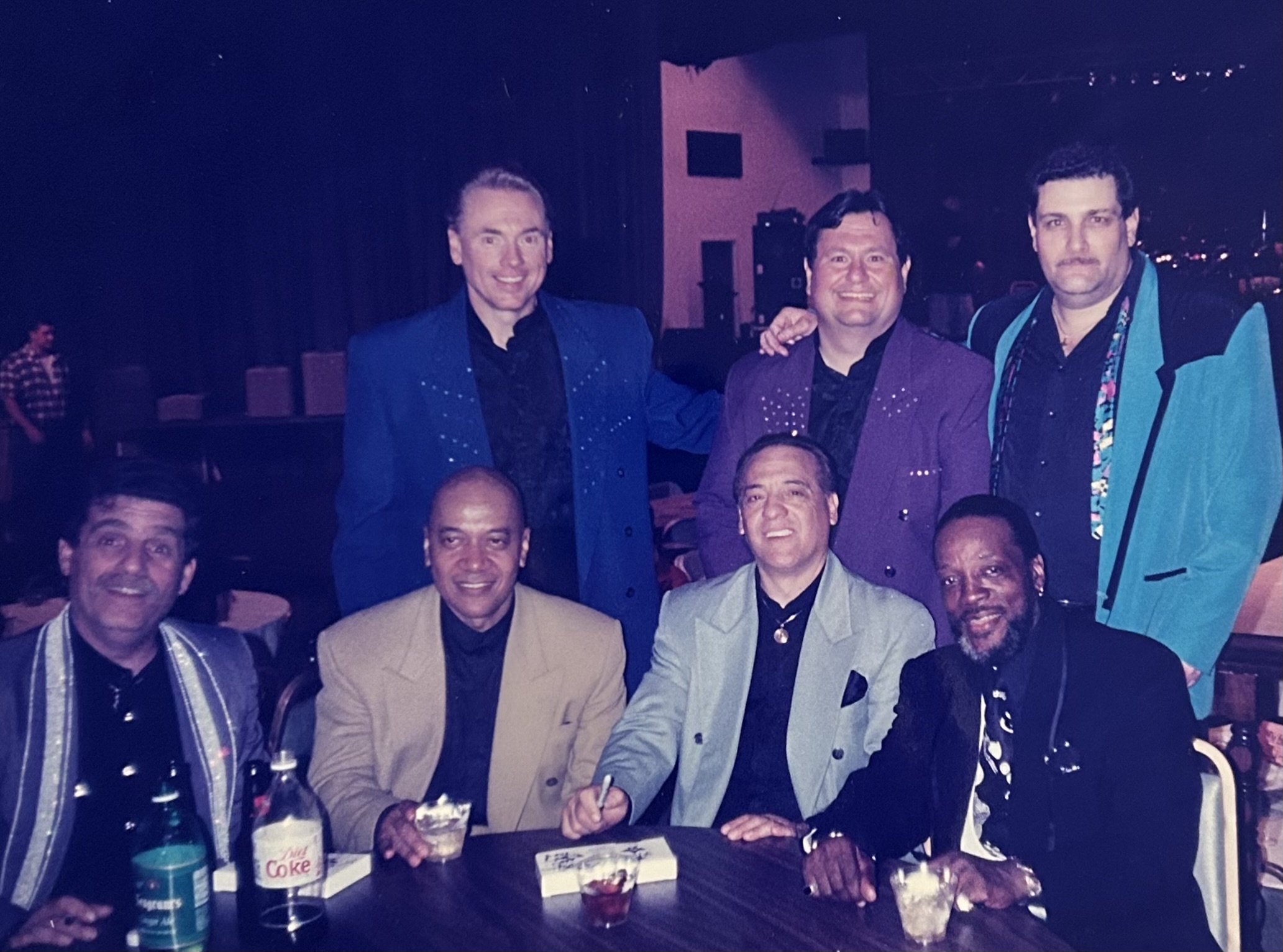 What do DooWopers do after a show at the theater? Well, we sit at a round table and sing some a cappella DooWop tunes! Hard to believe? It’s true! Well last week I wrote a blog about my old friend Eugene Pitt of the Jive Five celebrating his birthday and kind of got lost in the binders full of photos from singing over my 55+ year career. One photo that got me reminiscing was a show I/we did with the Royal All Stars at the Emerald Room Theater. Seven veterans, DooWopers sitting around talking about the music, the old songs, the many memories of performing and after singing for more than two and a half hours … we break into song each taking a lead but we all just wanted to sing harmony, that’s the true love of DooWop, street corner harmony, and a cappella. Human voices blending together making chords and rhythms … who wants to sing lead? The photo above is one of my favorite photos … standing left to right is yours truly, Johnny Angel, Gary “Bubba” Daley both of Johnny Angel and the Halos and Randy Silver of the Impalas. Sitting left to right is Art Loria of the Earls, Jimmy Merchant of the Teenagers, Vito Balsomo of the Salutations and Eugene Pitt of the Jive Five. After a few cocktails to relax and chill out … we break into song. Not long after that photo we ventured up to Long Island to the Tres Theater to do it again. I miss those days and especially some of our friends who are no longer with us who are now singing in Rock n’ Roll Heaven … I’m sure it is beautiful … I wonder if they have a hallway or stoop to sing on… or maybe a cool cloud to hand out. I’m not singing as much anymore but I do find myself reminiscing of the many artists, musicians and entertainers that I have worked with. If you are in the neighborhood on the Northside … stop by my Johnny Angel Ginchy Stuff and Museum … I have so many stories that I’d love to share with you … and who knows maybe a few DooWopers will pop in! Again, that photo above has a name … Just Some Of The Guys Sitting Around Singing DooWop!